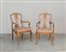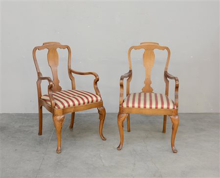 Coppia di poltrone con schienale a giorno, braccioli e gambe mosse (difetti)