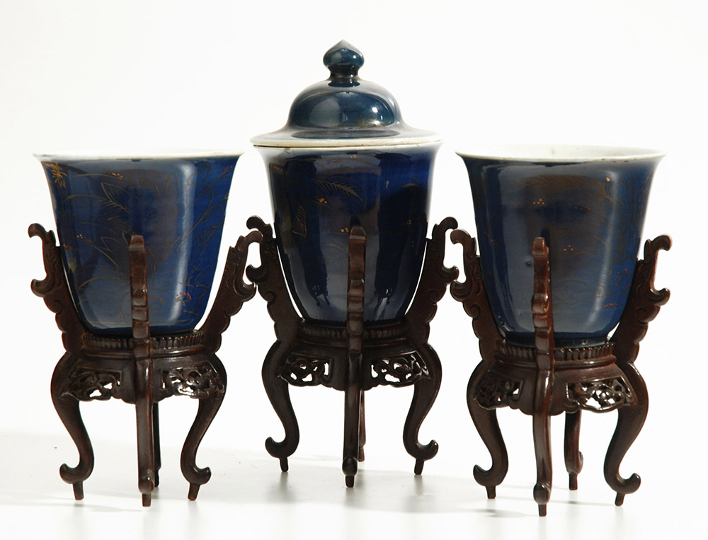 Manifattura di Cina, fine sec. XVIII Gruppo di tre vasetti in porcellana blu decorata a ramages in oro, argento e monocromia (h cm 8,2) (difetti). Basi in legno intagliato (uno con coperchio) A group of three blue and white jars (one with cover), decorated in gilding, silver and monochrome, late 18th century (damaged)