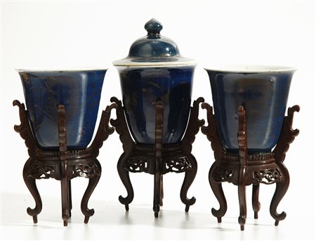 Manifattura di Cina, fine sec. XVIII Gruppo di tre vasetti in porcellana blu...