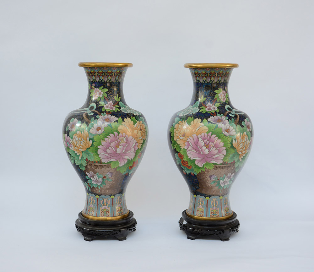 Coppia di vasi cloisonné decorati con motivi floreali su fondo blu, con basi in legno (lievi difetti) Cina, sec. XX (h. 59 cm.)