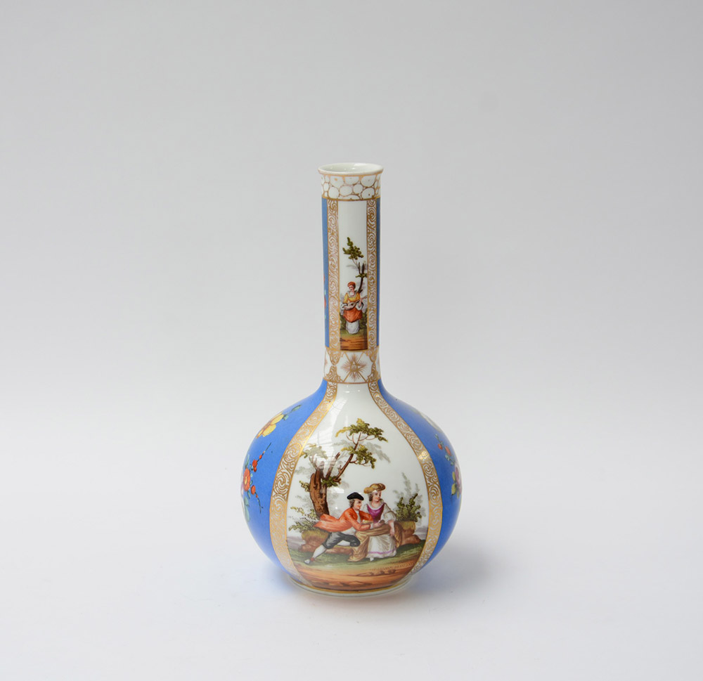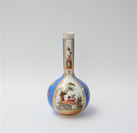 Manifattura del secolo XIX, vaso a collo stretto in porcellana decorata a fregi in oro ed in policromia con scene galanti e fiori (h cm 32)