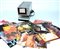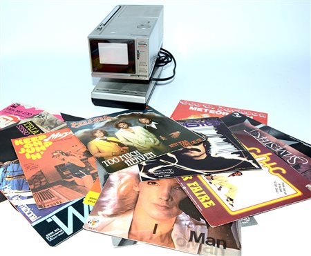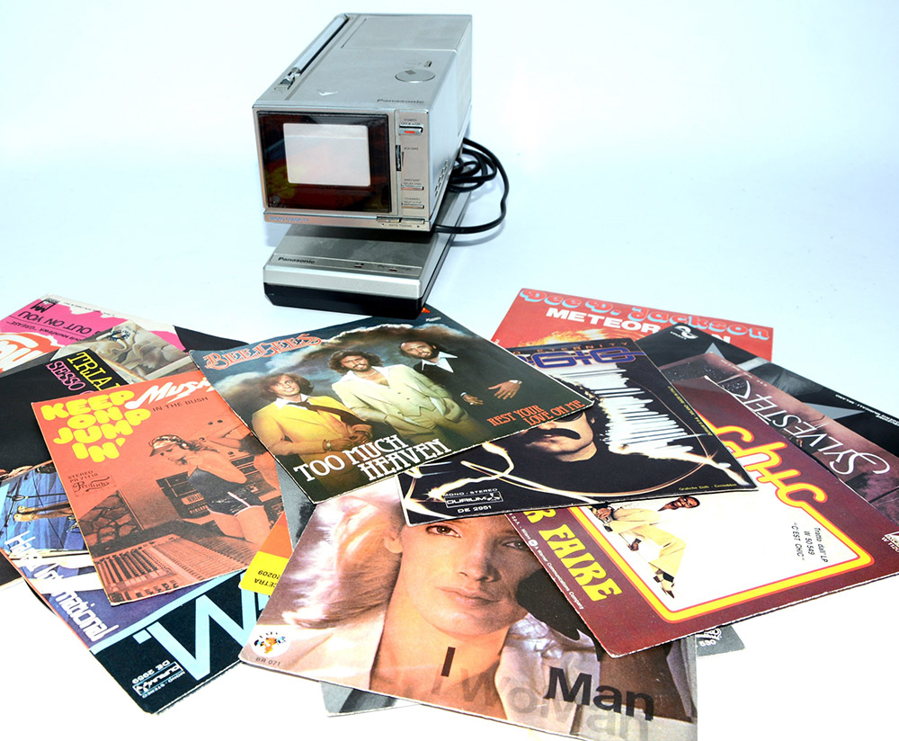 Cartone contenente un televisore portatile/monitor di controllo Panasonic, completo di accessori, e alcuni vinili 33 e 45 giri (difetti)