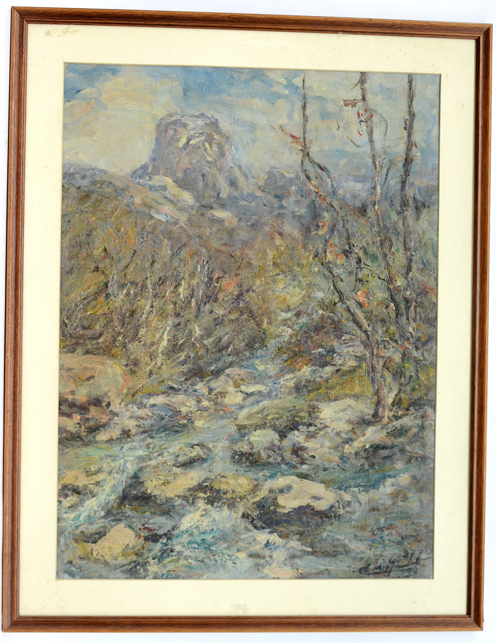 Carlo Aimetti Bisuschio 1901 Milano 1987 "Valle San Miro e i Corni. Canzo" 1977 olio su compensato(cm 80x60) Firmato e datato in basso a destra. Al retro: firmato, datato, locato e autenticato dall'artista. In cornice