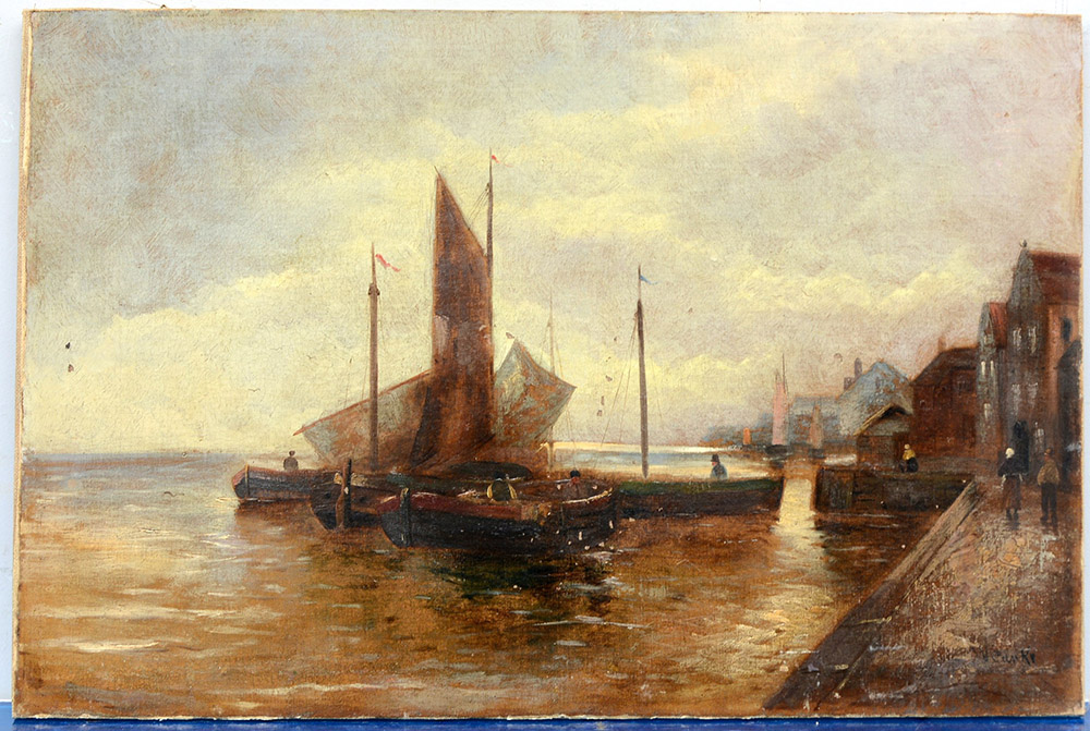 Firma indecifrata, "Scena portuale", olio su tela (cm 52x79) firmato in basso a destra (difetti e restauri)