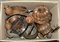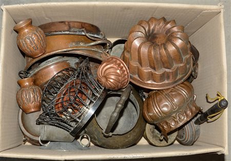 Cartone contenente tegami ed oggetti vari per la cucina in rame, peltro ed altri materiali (difetti)
