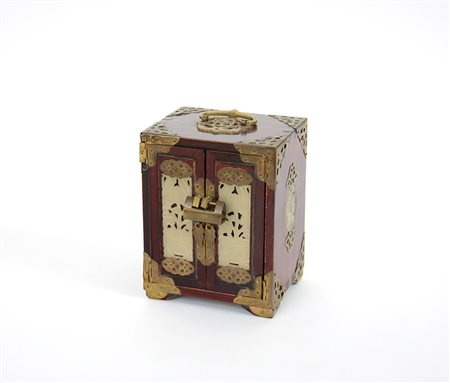 Mobiletto portagioie da tavolo con cassettini interni, in legno con decorazioni applicate in metallo e pietra dura (difetti e mancante della chiave) Cina, secolo XX (14x18x11 cm.)