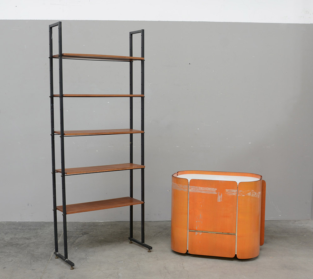 Lotto composto da un piccolo mobile bar di forma ovale ed una librerietta a giorno in metallo e legno (difetti)