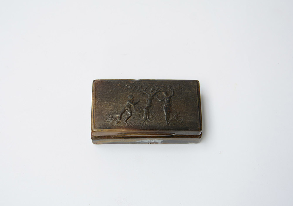 Tabacchiera in corno con coperchio decorato con Adamo ed Eva, secolo XIX (difetti)
