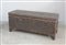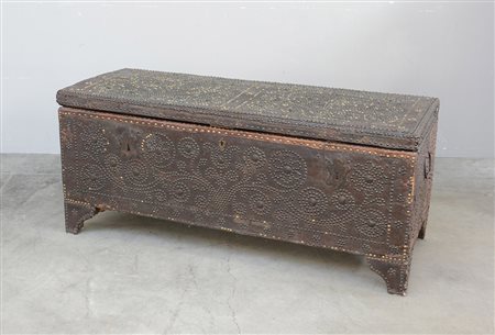 Antico cassone in legno rivestito in cuoio e decorato con borchie a volute e motivi floreali stilizzati (cm 138x60x57) (difetti e restauri)