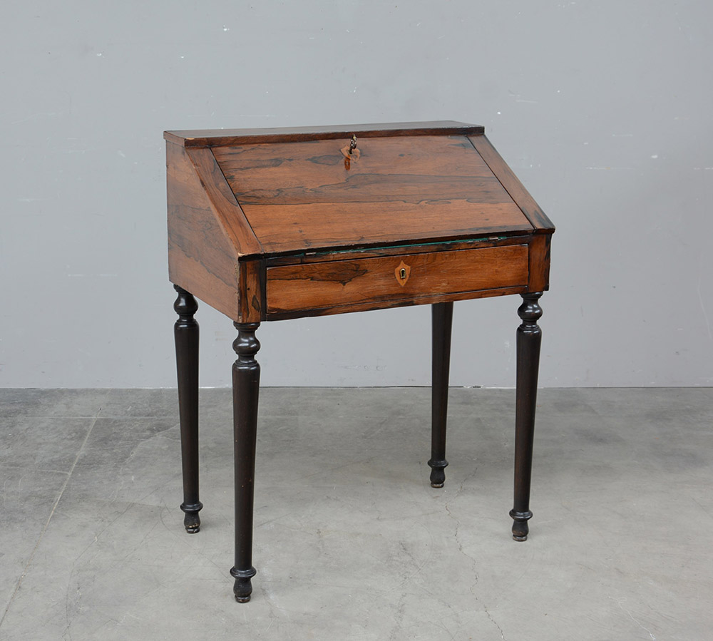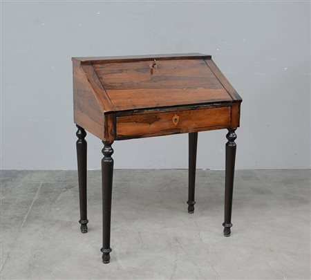 Piccolo scrittoio con ribalta, gambe tornite e cassetto grande nella fascia del piano; calatoia celante vani porta carte. Lombardia, secolo XIX (cm 80x102x49) (difetti)
