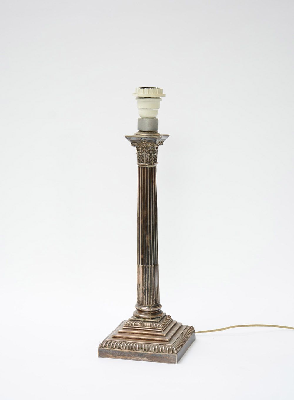 Candeliere in argento a foggia di colonna corinzia, montato a lampada. Città di Sheffield, 1908, argentiere Hawksworth, Eyre & Co Ltd (h. cm 39 ca.) (difetti)