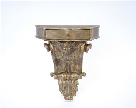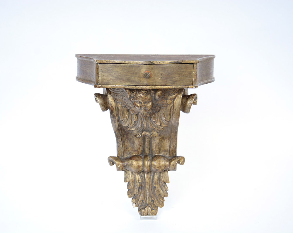 Mensola in legno scolpito e dorato decorato a cartiglio, foglie di acanto e testa di cherubino, con piano a fascia mossa e cassetto (cm 49x41x26) (difetti e mancanze)