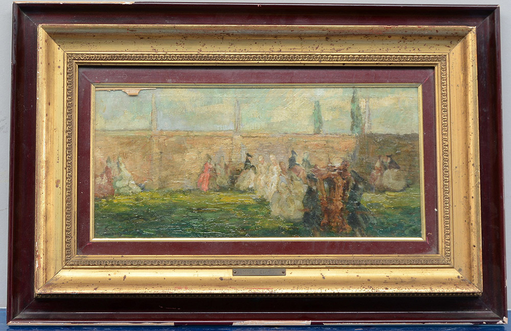 Scuola del secolo XIX "Figure in un parco" olio su tavoletta (cm 20x40) in cornice (difetti)