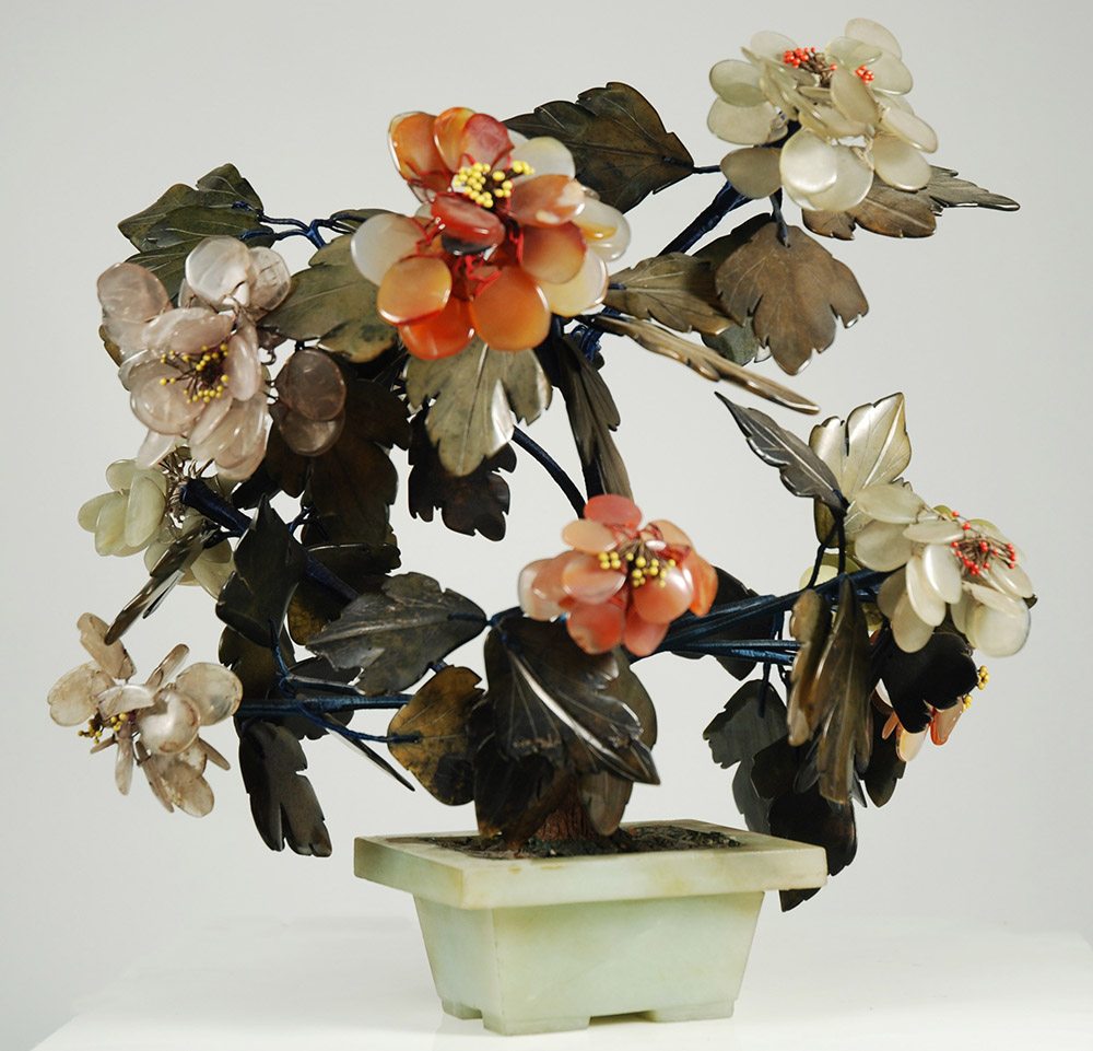 Manifattura di Cina, sec. XX Vasetto in giada contenente fiori in pietra dura (difetti)