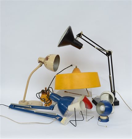 Lotto composto da tre lampade da scrivania, un lampadarietto saliscendi, due lampade da tavolo e due appliques in metallo e metallo laccato (difetti)