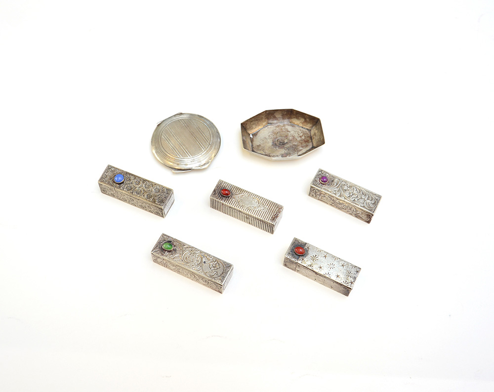 Lotto in argento composto da cinque portarossetto un vassoietto ottagonale e un porta cipria (lievi difetti)