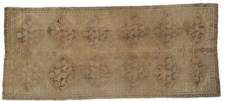 Tappeto Hila Caucaso, inizio del sec. XIX, disegno a medaglioni romboidali ipetuti nei toni azzurro, beige e marrone (cm 365x160) (gravi difetti) Early 19th-century Hila Caucasian carpet (major defects)
