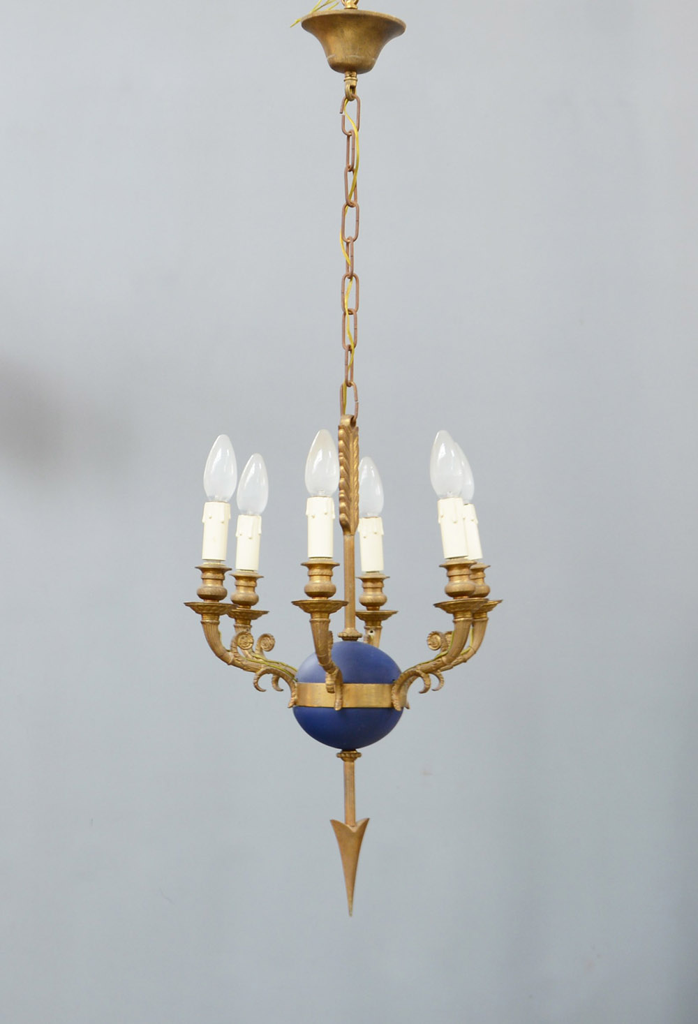 Piccolo lampadario a sei luci in bronzo dorato e parzialmente smaltato in blu, con sostegno centrale a freccia (d cm 36) (difetti)