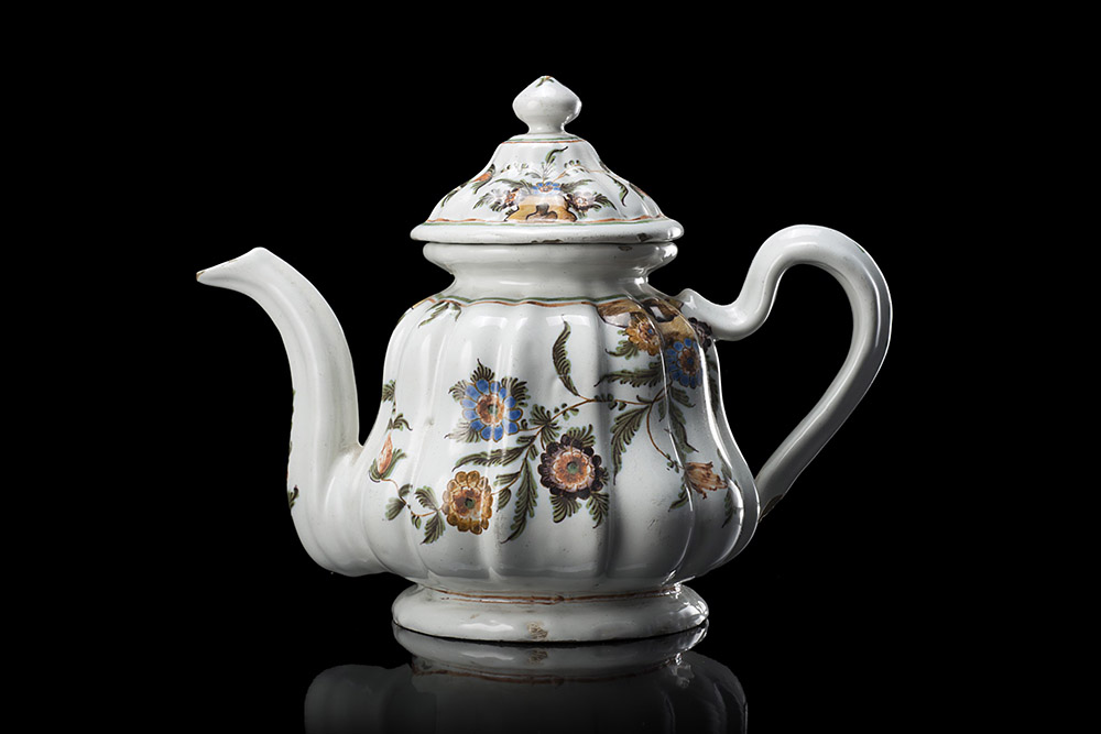 Teiera in maiolica con corpo piriforme costolato, lungo beccuccio ed alto manico a voluta. Decorazione ‘a blanser’ (h. cm 16) Nove, Bassano, Antonibon, sec. XVIII (sbeccatura al piede e mancanza al manico) Majolica teapot. Nove, Bassano, Antonibon manufactory, 18th century (chipping and losses)