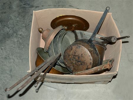 Cartone contenente pignatte in rame ed oggetti per la cucina (difetti)