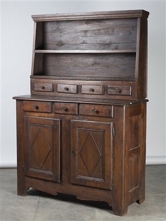 Credenza con piattaia con parte superiore a giorno e cassetti parte inferiore con due ante pannellate e tre cassetti sottopiano, epoche diverse (cm134x196x56)