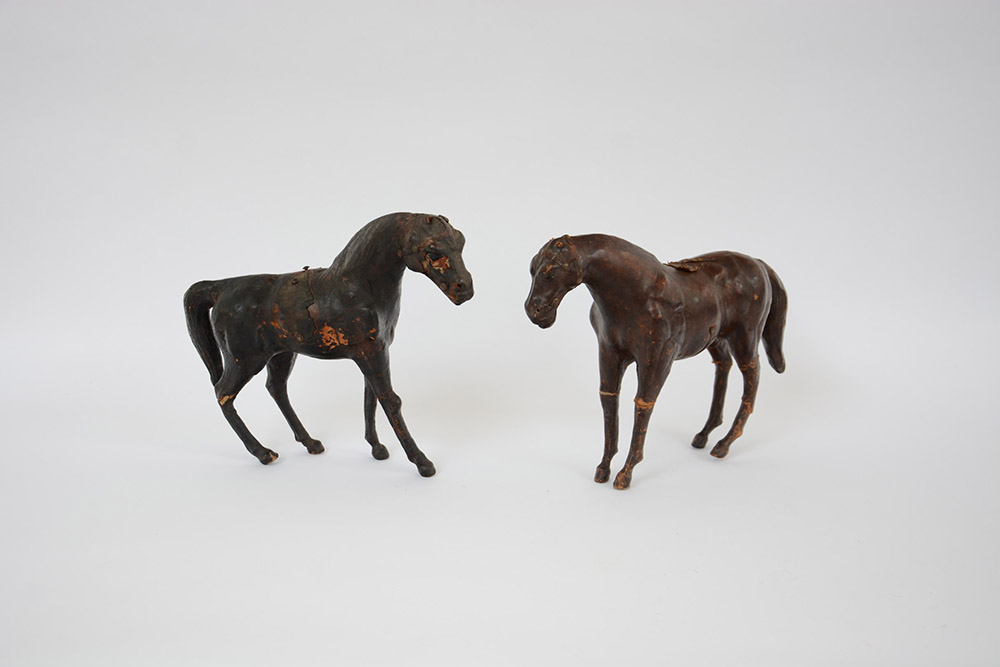 Lotto di due cavalli giocattolo rivestiti in cuoio, secolo XIX (h cm 28) (difetti e mancanze)
