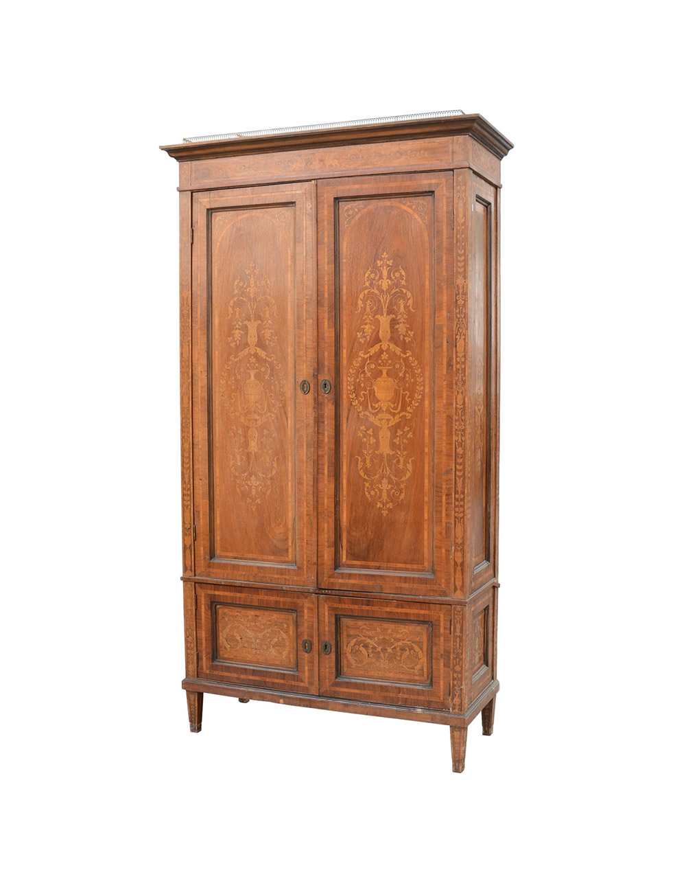 Mobile bar a due ante piccole e due grandi nella base, interamente intarsiato a vasi fioriti e candelabri. Interno rivestito a specchi (cm 114x210x48) (difetti)