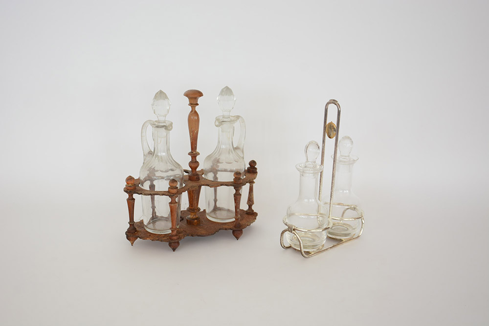 Lotto composto da due cruet in legno e metallo cromato di epoche differenti (difetti)