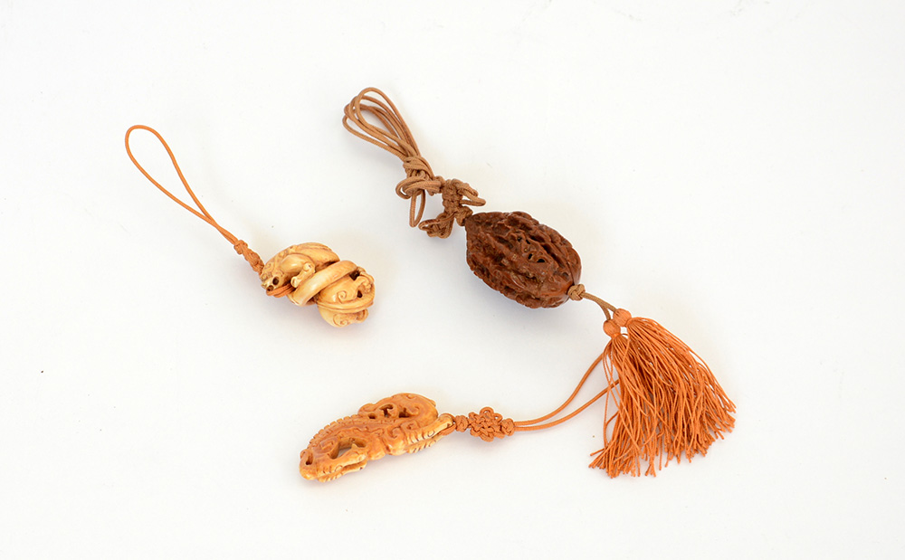 Due intagli in avorio e una noce Cina, inizio sec. XX (l. max. 5 cm.)
