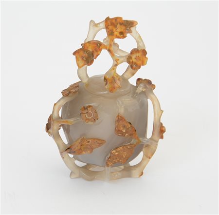 Vasetto con coperchio in agata scolpito con rami in fiore e volatili Cina, sec. XIX (h. 13 cm.)