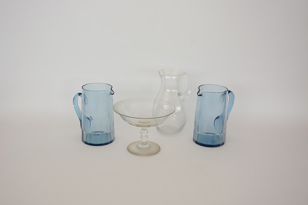 Manifatture diverse. Lotto composto da tre versatoi e un'alzata in vetro (difetti)