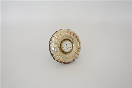 Orologio da tavolo con cornice in argento; schienale in legno di forma circolare. Italia, inizio sec. XX (d. cm 14) (difetti)