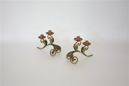 Coppia di candelieri in ferro battuto e laccato decorato a foglie (h. cm 22)