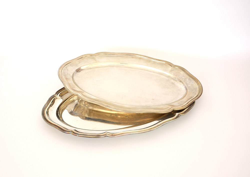 Lotto in argento composto da due vassoi di forma ovale sagomata. Italia, sec. XX (cm max 53x34) (gr 2670) (difetti)