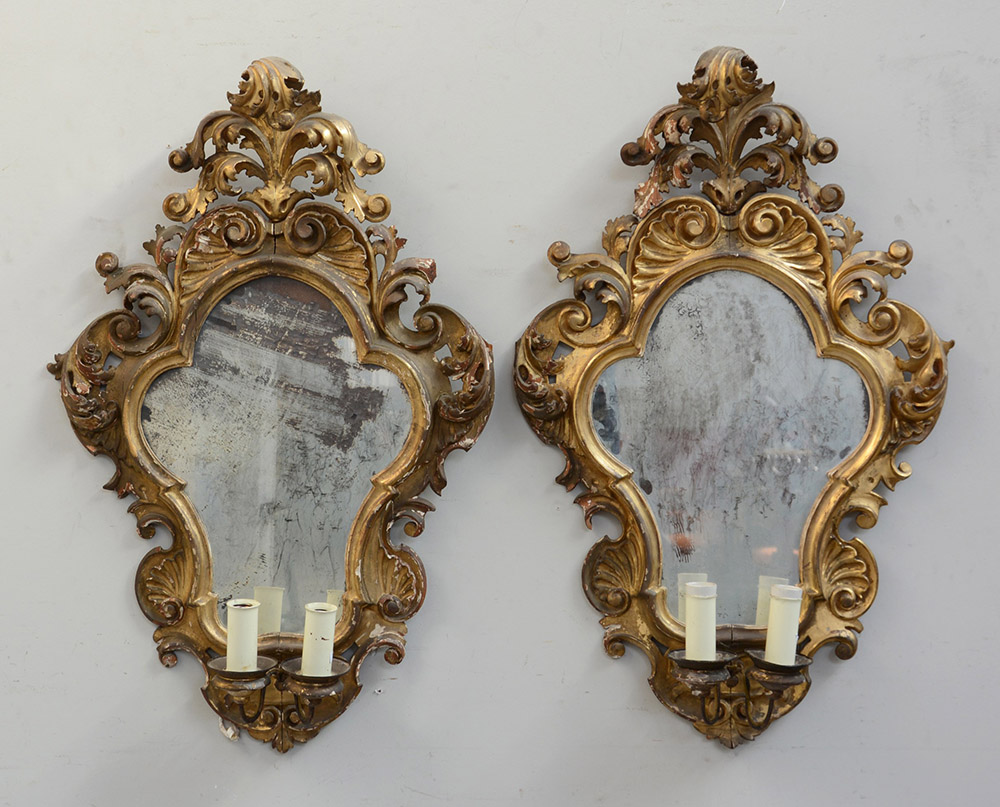 Coppia di ventole a due fiamme in legno intagliato e dorato a volute e foglie d'acanto (cm 95x60) (difetti e mancanze)
