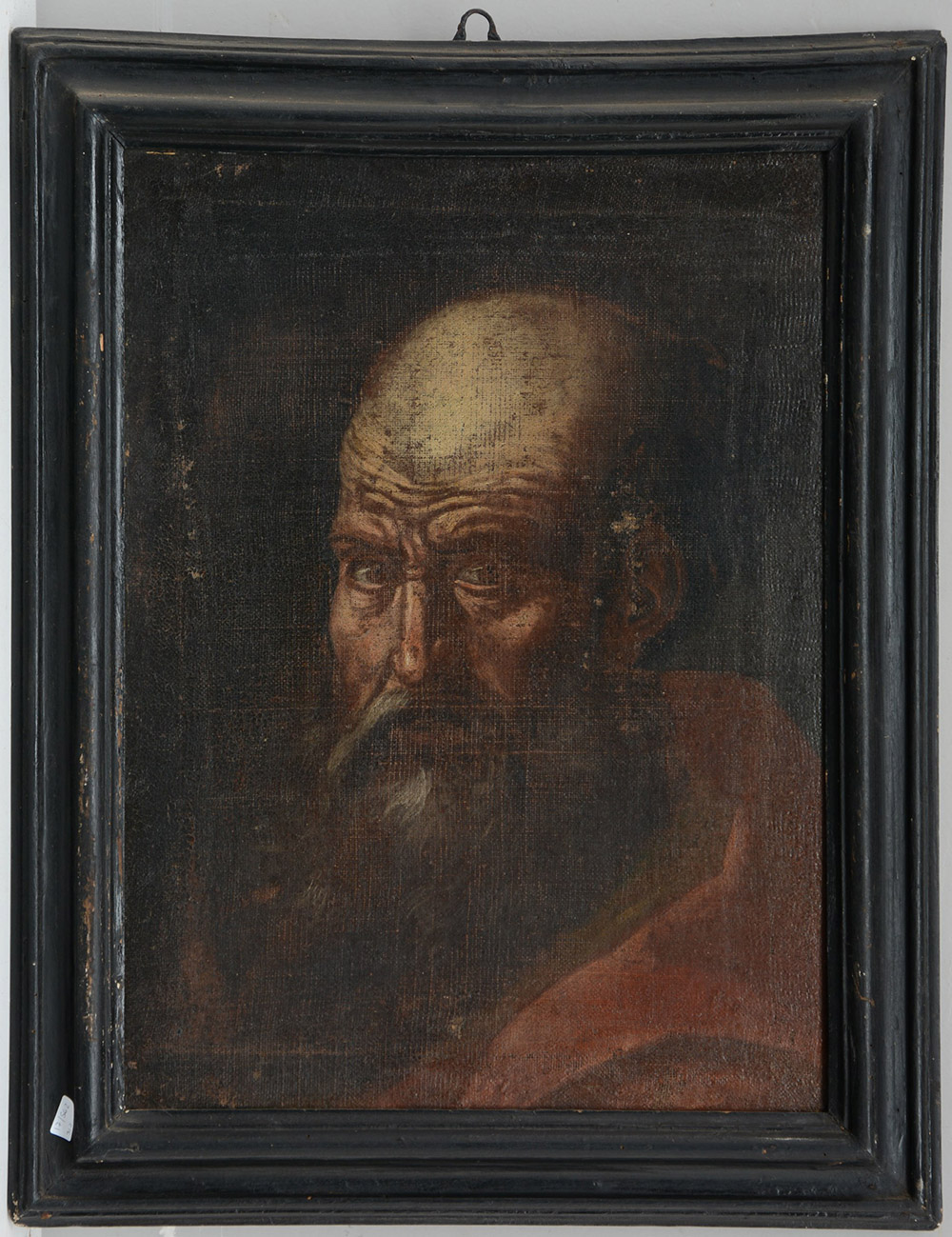 Scuola Veneta del XVII secolo "Volto di filosofo" olio su tela (cm 54x37) In cornice in legno ebanizzato (difetti e restauri)