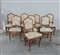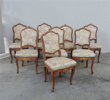Lotto composto da otto sedie del sec. XVIII/XIX in legno laccato e dorato rivestite in tessuto a fiori (lacca di epoca posteriore, difetti e restauri)