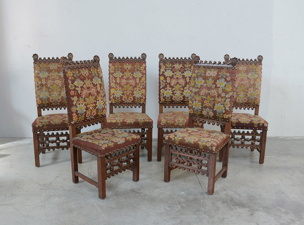 Gruppo di sei sedie intagliate e traforate a motivi stilizzati e valve di conchiglia. Gambe dritte con fascia scolpita a motivi concatenati geometrici. Rivestite in tessuto a piccolo punto a fiori (difetti)