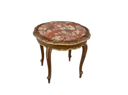 Tavolo da salotto in legno laccato e dorato decorato con piano in marmo (d. cm 63x h. cm 55) (difetti e mancanze)