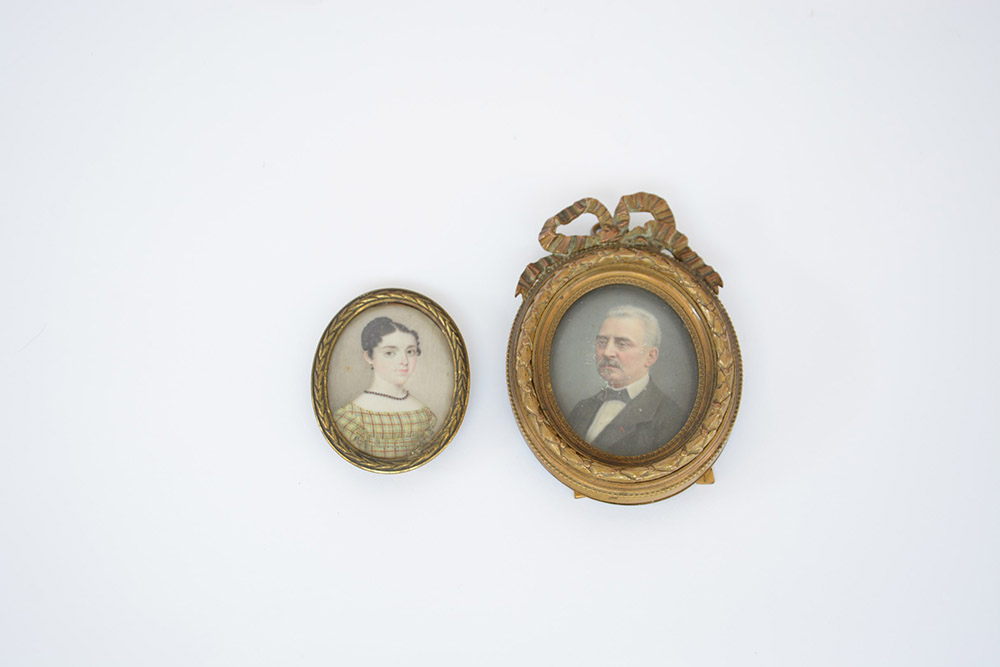 Lotto composto da due miniature raffiguranti gentiluomo e gentildonna di materiali diversi. In cornici (difetti)