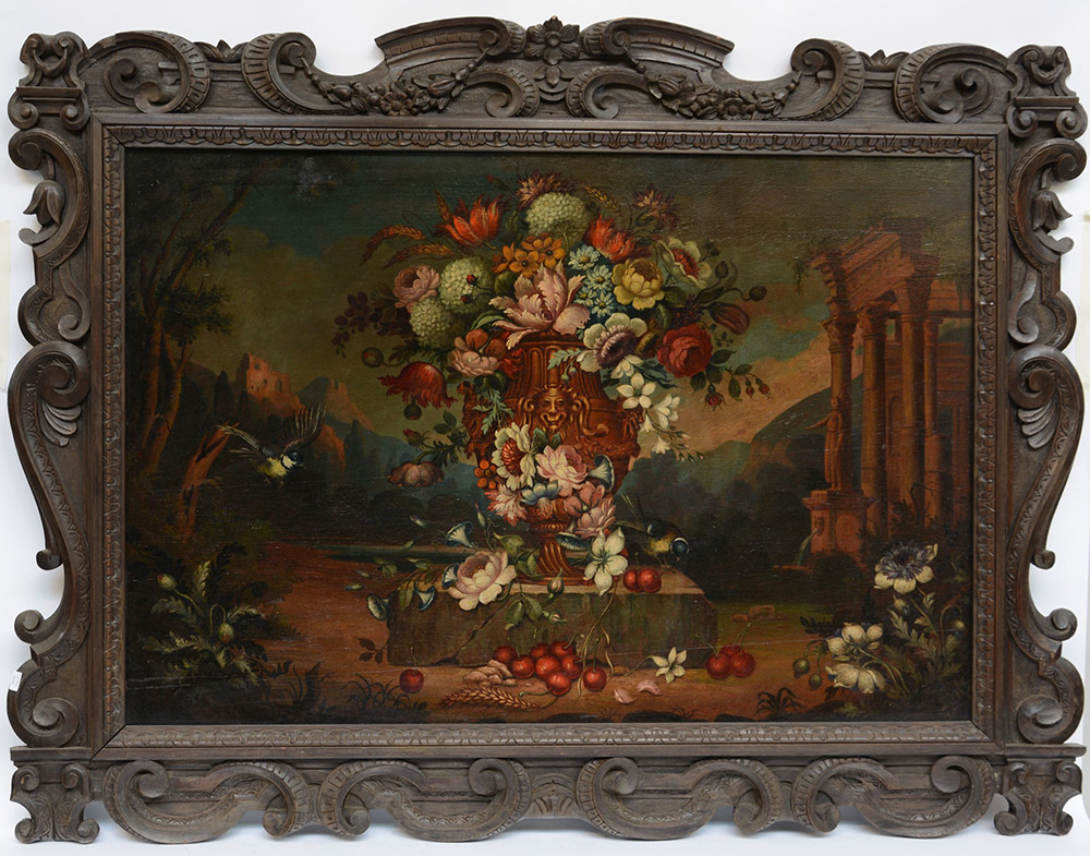 Ignoto "Vaso fiorito in un paesaggio con rovine", olio su compensato (cm 70x100) In cornice in legno intagliato a volute