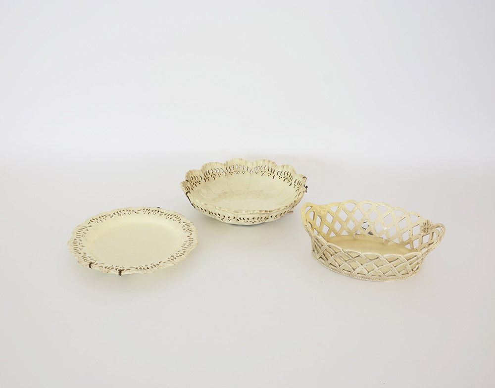 Manifattura sec. XIX. Lotto composto da due piatti e un cestino in ceramica a bordi traforati (difetti e restauri)