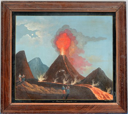 Anonimo napoletano, "Eruzione del Vesuvio", gouache (cm 45x52), titolata al centro, in cornice (difetti)