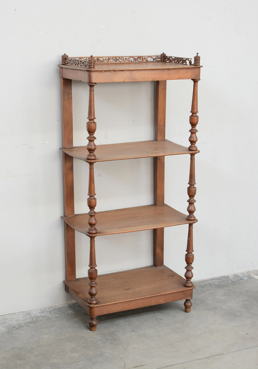 Etagère a quattro ripiani con montanti a colonne tornite e ringhiera traforata. Sec. XIX (cm 56x123x35) (difetti e mancanze)