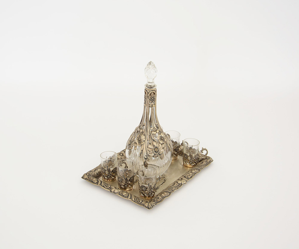 Servizio da rosolio in argento e vetro composto da bottiglia, sei bicchieri e vassoio decorati con motivi floreali. Germania/Italia, inizio sec. XX (vassoio cm 23x17,5; h. max 23,5 ca.) (lievi difetti)