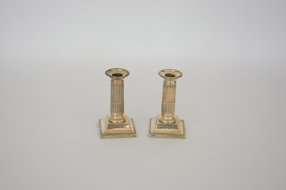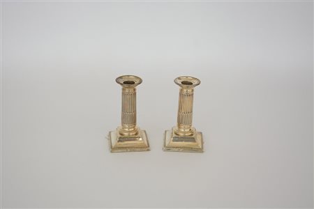 Coppia di candelieri in argento con fusto a colonna. Londra, 1887. Argentieri...