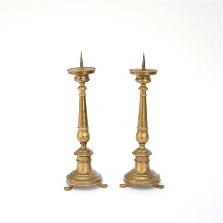 Coppia di portaceri in ottone con corpo tornito a fuso sorretto da zampe...