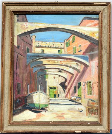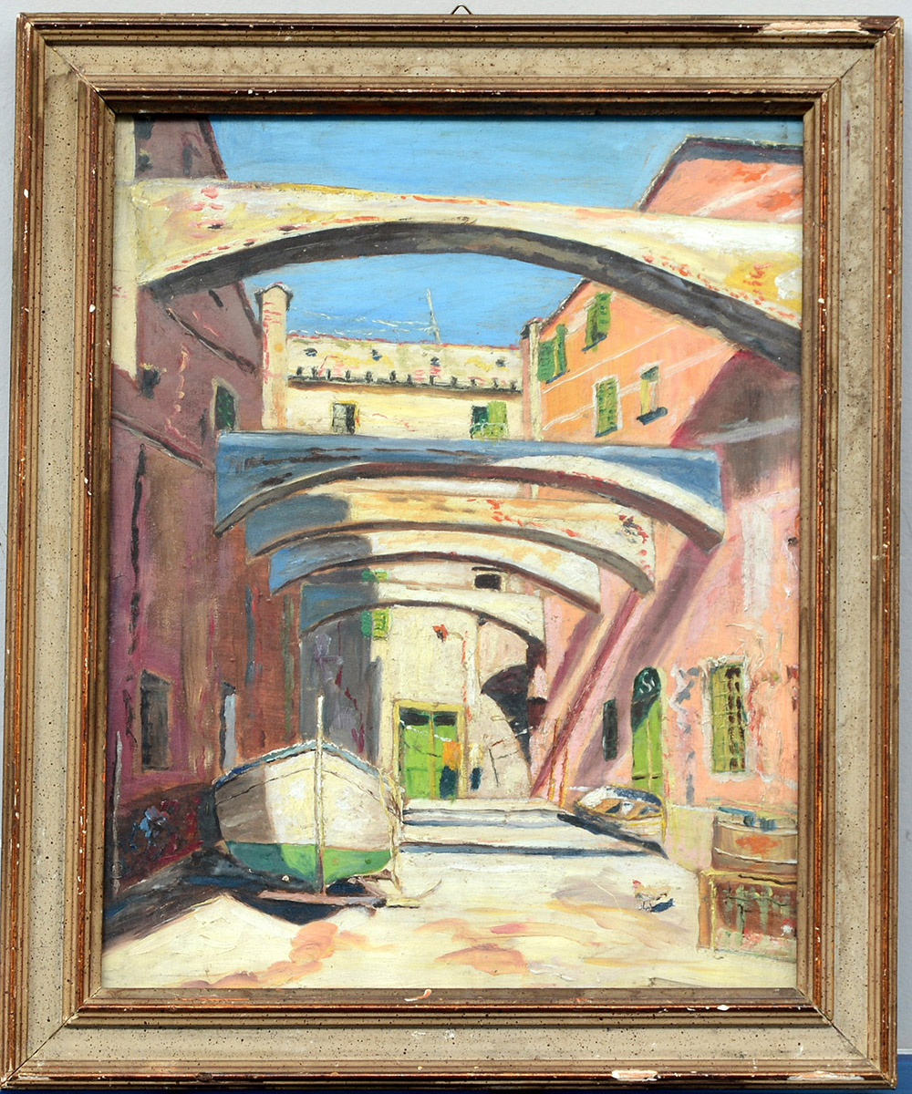 Ignoto "Scorcio in cortile" olio su compensato (cm 29x23) in cornice