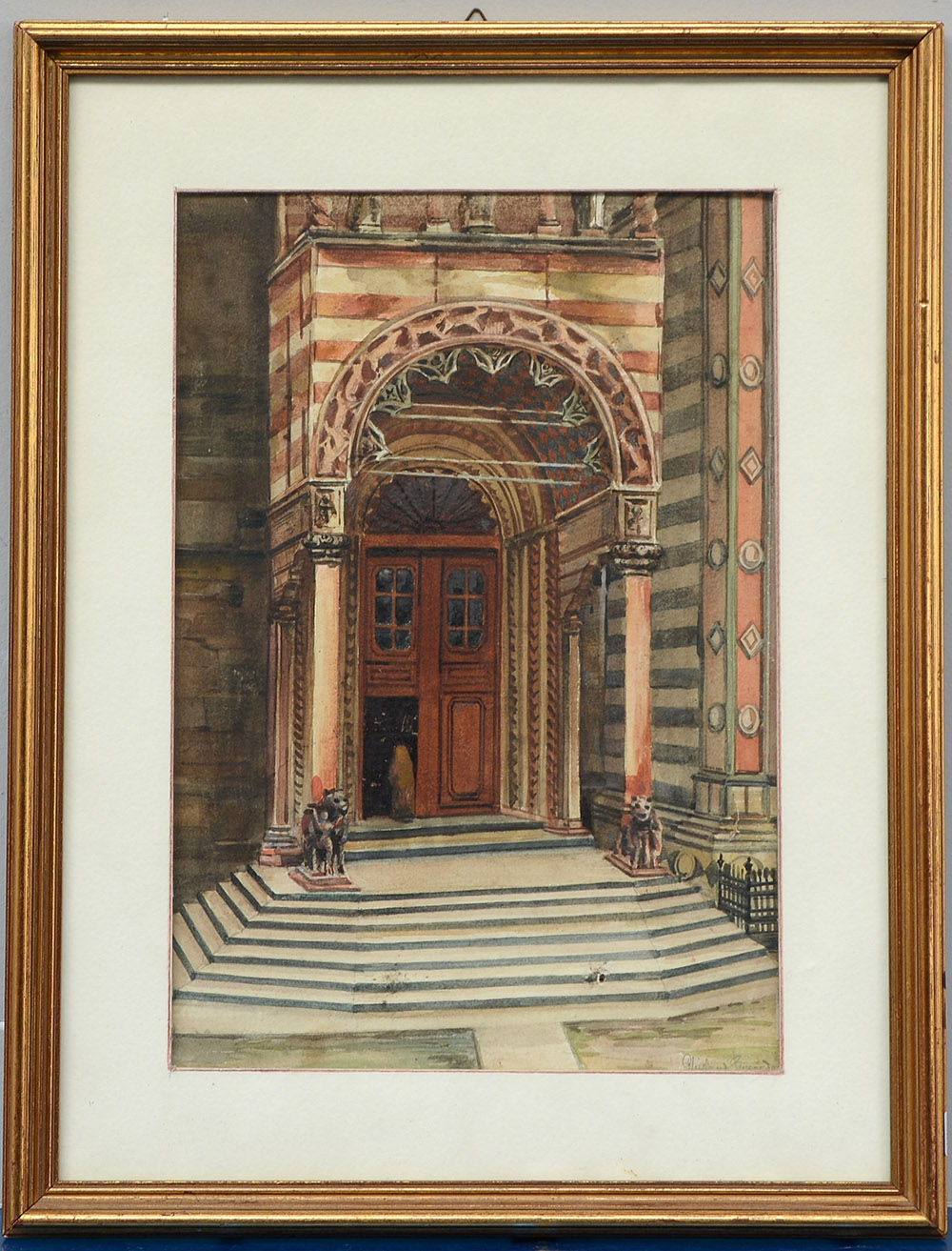 Firma indecifrata "Ingresso in chiesa" acquarello (cm 33x22) firmato in basso a destra. In cornice