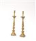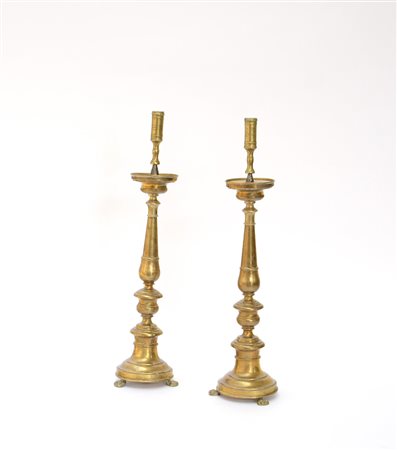 Coppia di portaceri in ottone con corpo tornito a fuso, sorretti da tre...